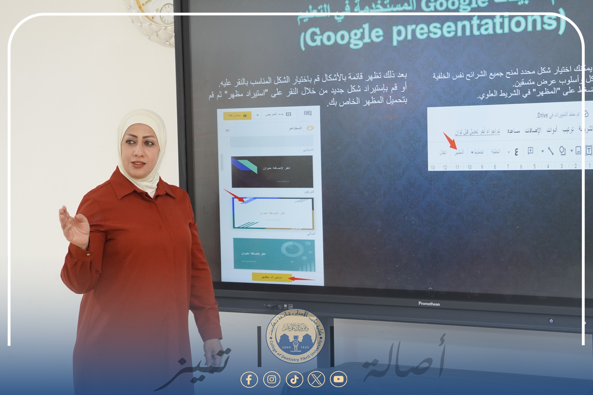 Under the patronage of Professor Dr. Waad Mahmoud Raouf, President of Tikrit University, and under the supervision of Assistant Professor Dr. Mohammed Raheel Ali, Dean of the College of Dentistry, and Assistant Professor Dr. Sayyaf Abdul Hussein, Director of the Continuing Education Center, the Continuing Education Center, in cooperation with the College of Dentistry, organized a training course entitled “Google Services in Education.”